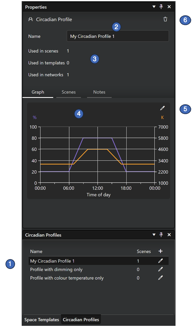 6. Delete button for deleting the selected circadian profile. Note, that if a profile is deleted, it is removed from all scenes it has been used.