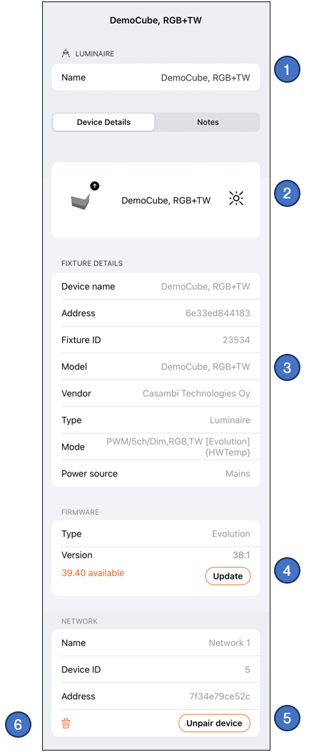 Fixture details from its fixture profile in Casambi database.