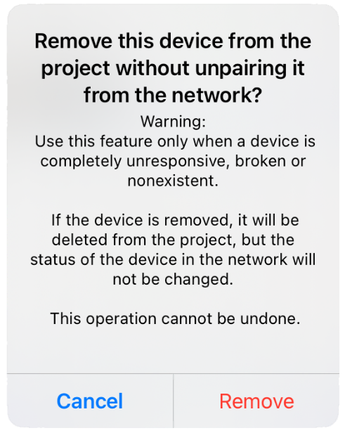 In some rare cases, a device cannot be unpaired from the network. For example, the device may have been physically from the site, or it is broken and does not respond anymore. In this kind of cases, a device can be removed from the project without unpairing.