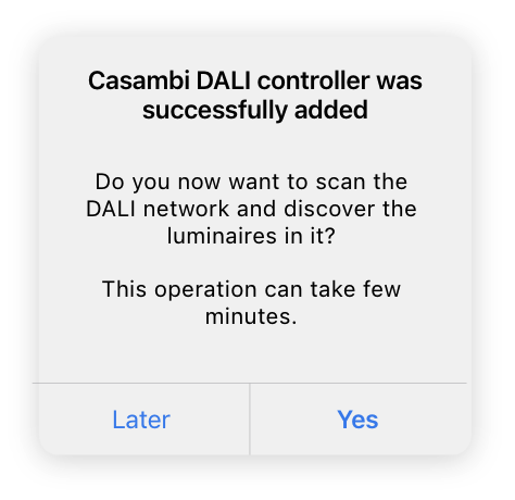 At the end of pairing of a Casambi Salvador unit, Casambi Pro will ask if you want to proceed to discover the DALI drivers in the DALI network. The discovery can be done also later if you don’t want to run the discovery immediately when pairing the Salvador unit.