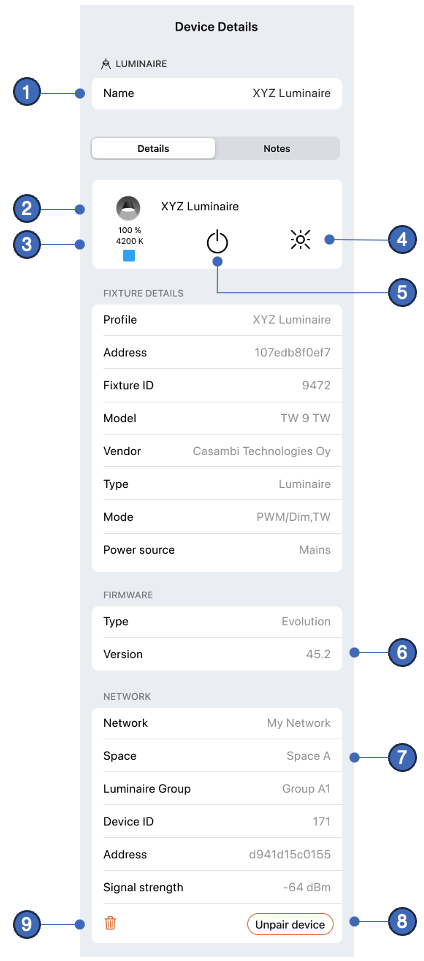 - Unpair Device button, which can be used to remove the luminaire from the current network.