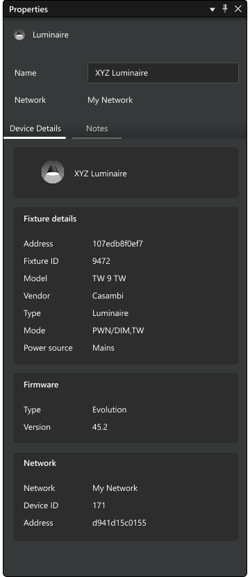 In Casambi Pro for Windows, the luminaire properties are visible only after the real luminaires have been paired to luminaire groups. Luminaire properties are visible in the Properties pane when a luminaire is selected.