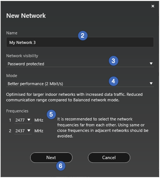 - Select mode for the network. The network mode and network frequencies can only be configured when creating a network for the first time and cannot be changed after a network has been taken into use.