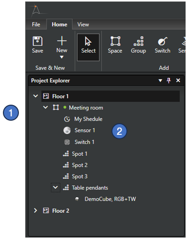 The Project Explorer works similarly in both Windows and iOS versions of Casambi Pro.