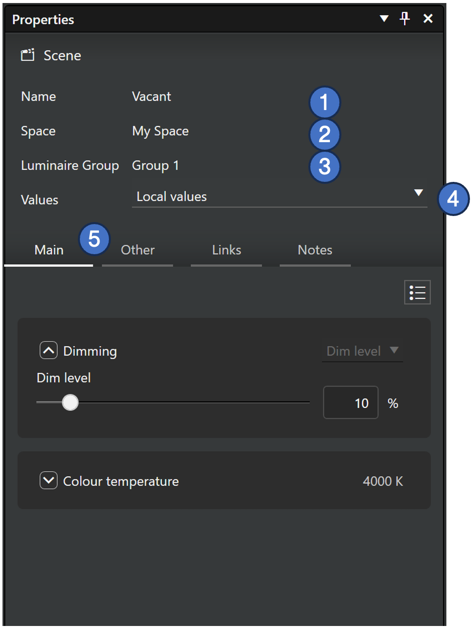 1. By default, all groups in the space will participate in the scene with the scene’s default values. Each Luminaire group’s relation to the scene can be managed with these options in the properties pane: