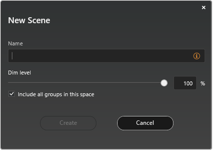 New Scene dialog showing name and default dim level fields
