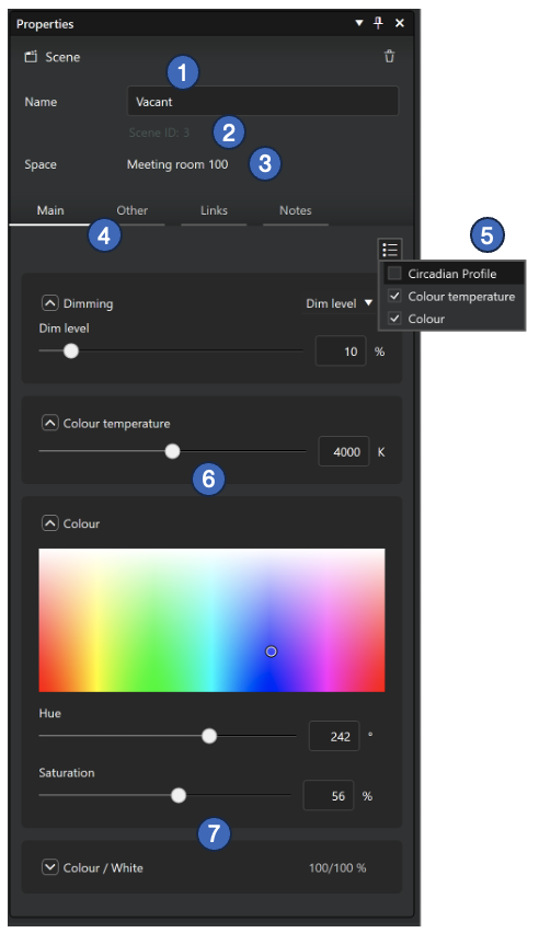 Dimming level is the only mandatory parameter for a scene in Casambi Pro. When needed, additional parameters can be activated in the Mains and Other tabs. In the initial Casambi Pro versions, there are three additional parameters: Colour Temperature, Colour and Up/Down light ratio. More parameters will be added in future releases.