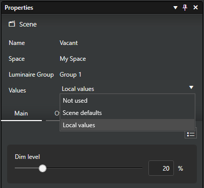 • Local values: Use customized values for the luminaire group, instead of the scene defaults.